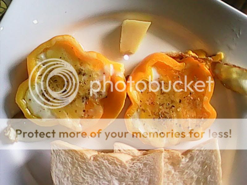 1 cm dicke Scheiben aus der mitte eine Paprikaschote kurz in butter anbraten, Ei reinschlagen, Käse drauf, nach gusto würzen und mit Deckel kurz braten. -> Aroy mak mak ...