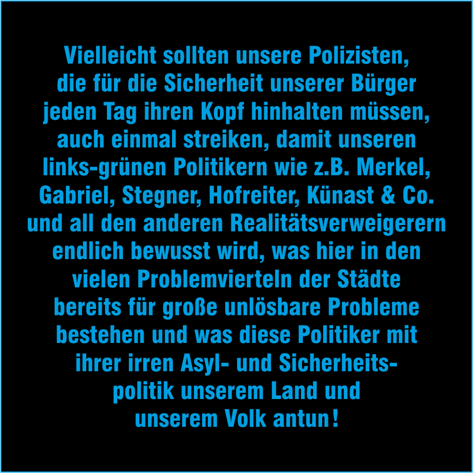 Politically IncorrectAus einer System-Medien Quelle, welche normalerweise fuer politische Luegen bekannt ist, aber in Anbetracht der bitteren Realitaet - ebenso wie die CDU/CSU - sich immer naeher an die Grundsaetze von AfD und der Buergerbewegung PEGIDA annaehert: