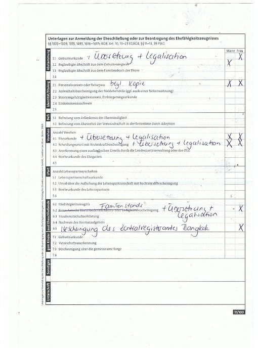 nur die Unterlagen der Thaifrau müssen Übersetzt und Legalisiert werden, und dann bei der Deutschen Botschaft in BKK abgegeben werden (Dauer zirka 6-8 Wochen). Sollte die Dame nur Buddhistisch geheiratet haben so fallen die Eheurkunde und das Scheidungsurteil weg.